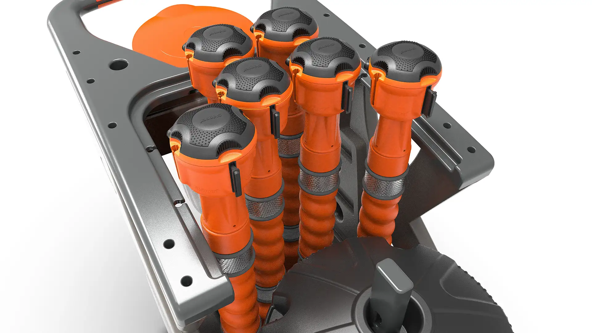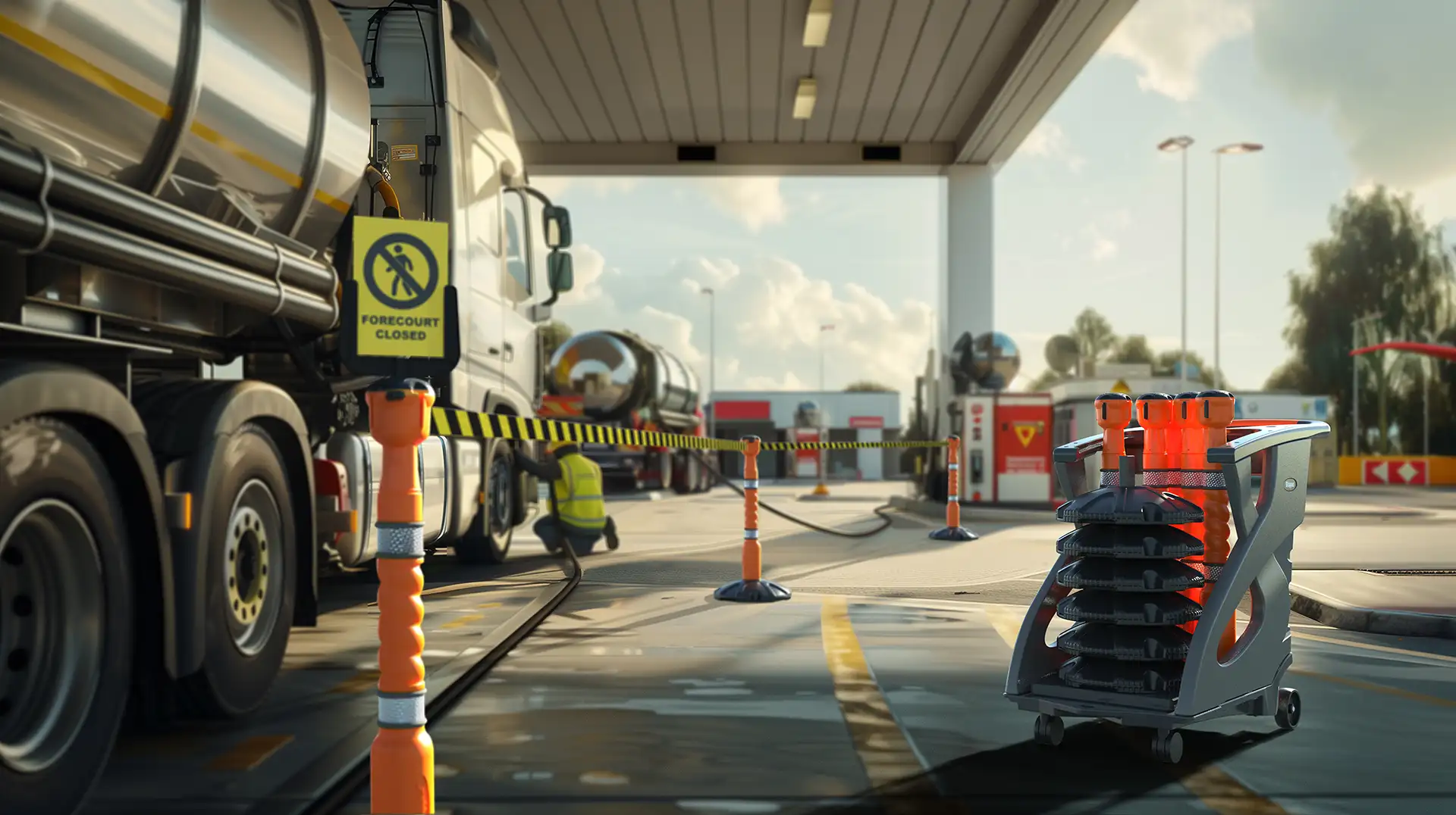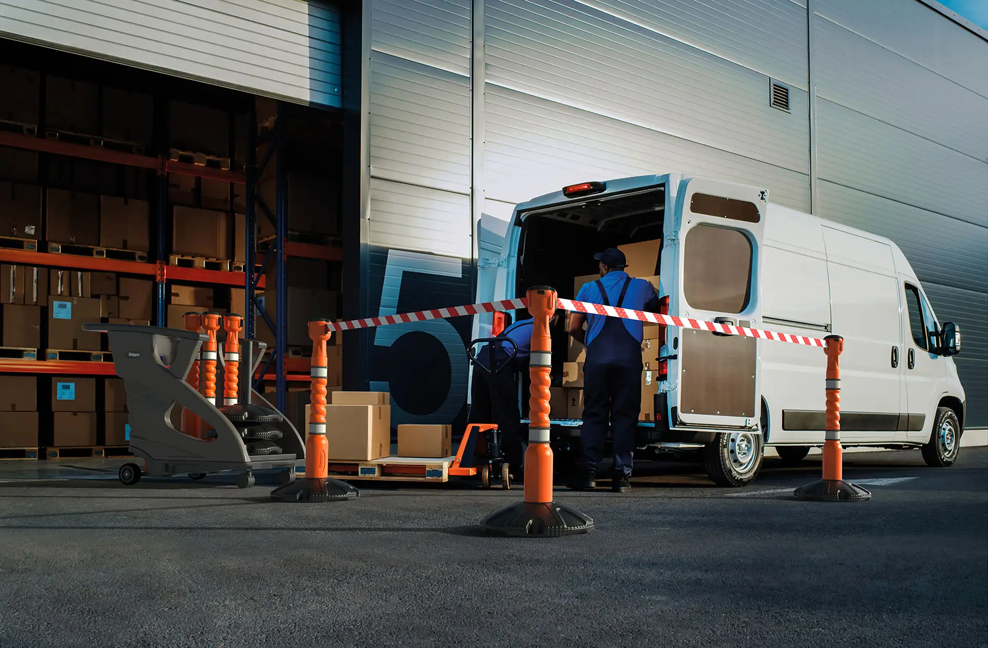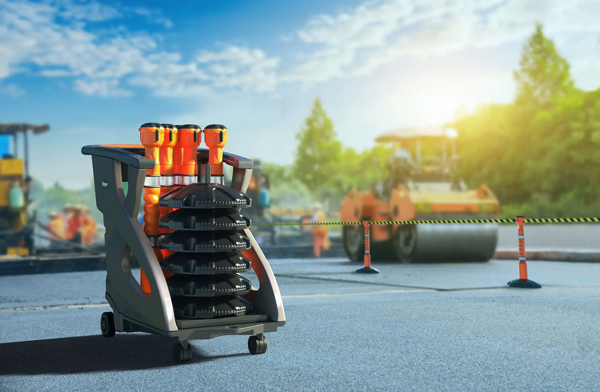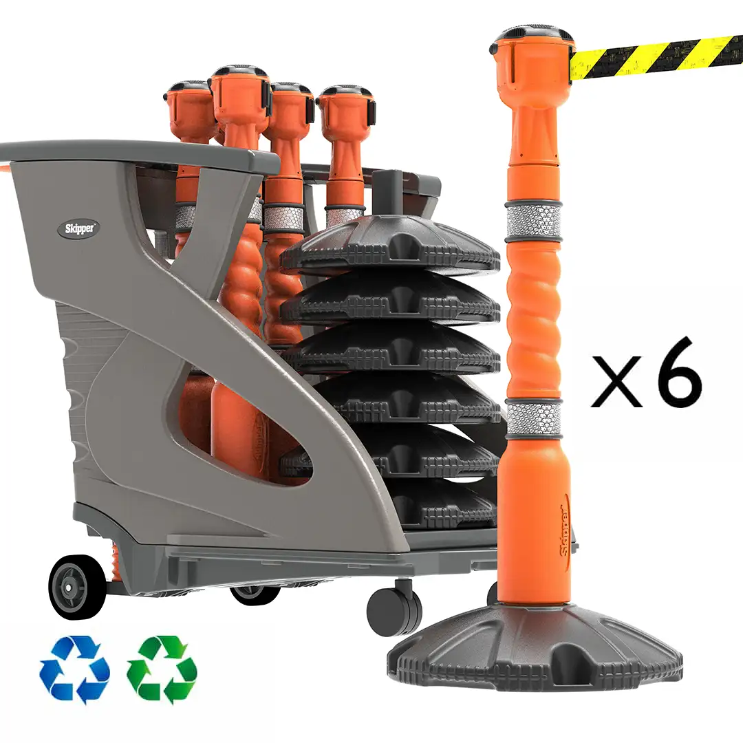 With the base tray , you can stack up to six Skipper posts and six Skipper bases and will take the weight of 100 KG + when the bases are filled with water. Seen here housing the orange Skipper barrier system, the Skipper Unicart is easy to manoeuvre thanks to its large ergonomically designed handle, brakes and suspension on the rear wheels.